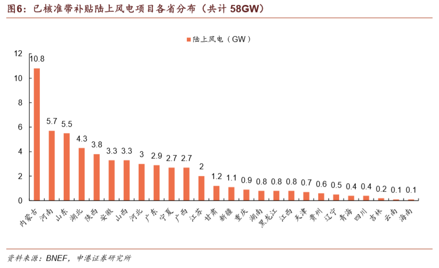內(nèi)蒙古脫離紅色預(yù)警區(qū)后,大量項(xiàng)目被釋放,待建帶補(bǔ)貼項(xiàng)目達(dá)10.8GW。河南、山東待建項(xiàng)目同樣分別高達(dá)5.7GW、5.5GW,體現(xiàn)出風(fēng)電項(xiàng)目建設(shè)重點(diǎn)逐漸從三北地區(qū)向中東南地區(qū)轉(zhuǎn)移的特點(diǎn)。