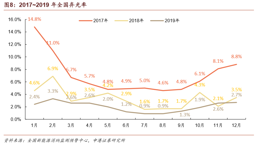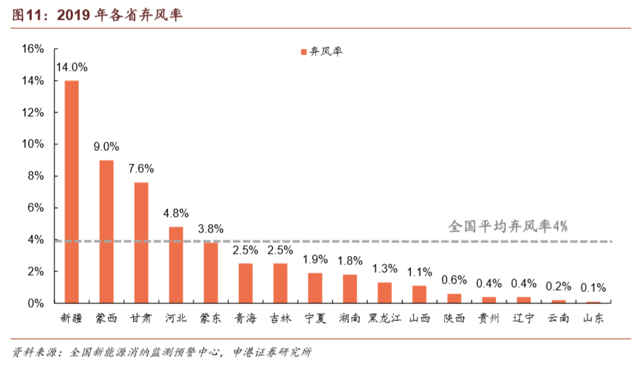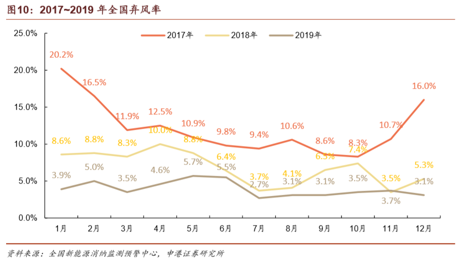 上一輪搶裝期過后,風(fēng)電場(chǎng)的并網(wǎng)需求遠(yuǎn)高于電網(wǎng)的消納能力,導(dǎo)致棄風(fēng)率在2016年達(dá)到高點(diǎn)。在風(fēng)電投資預(yù)警監(jiān)測(cè)機(jī)制的限制下,諸多已核準(zhǔn)項(xiàng)目陷入冷凍期。在經(jīng)歷了2015年15%、2016年17.1%的棄風(fēng)率高峰之后,棄風(fēng)率已連續(xù)三年實(shí)現(xiàn)下降,2019年實(shí)現(xiàn)棄風(fēng)率4%,同比降低3 pct,繼續(xù)保持即可滿足2020年棄風(fēng)率要求。