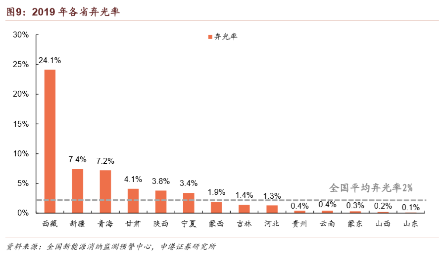 2019年我國棄風(fēng)、棄光率實(shí)現(xiàn)雙降,消納形勢(shì)繼續(xù)改善。全國平均棄光率為2%,同比下降1 pct。棄光率高于全國平均水平的省份有西藏(24.1%)、新疆(7.4%)、青海(7.2%)、甘肅(4.1%)、陜西(3.8%)、寧夏(3.4%),集中在我國西北地區(qū)。同期全國平均棄風(fēng)率為4%,同比下降3 pct。棄風(fēng)率高于全國平均水平的省份/地區(qū)有新疆(14%)、蒙西(9%)、甘肅(7.6%)、河北(4.8%